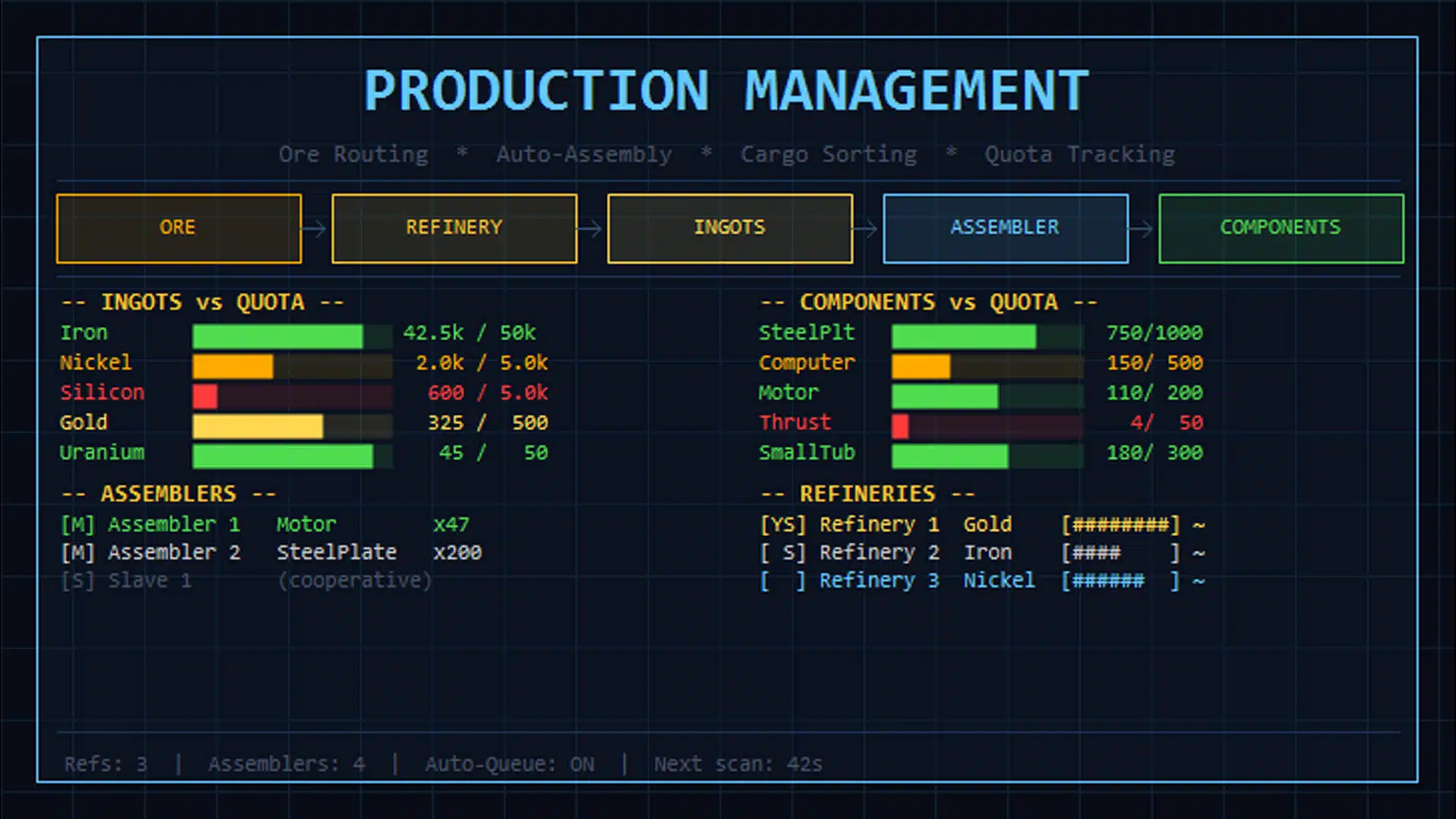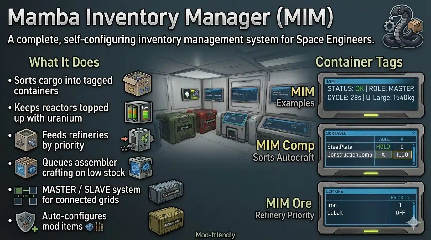 Mamba Inventory Manager (MIM)A complete, self-configuring inventory management system for Space Engineers. Sort cargo, fuel reactors, feed refineries, autocraft components, and manage Safe Zone chips — all controlled through in-game LCD panels. |