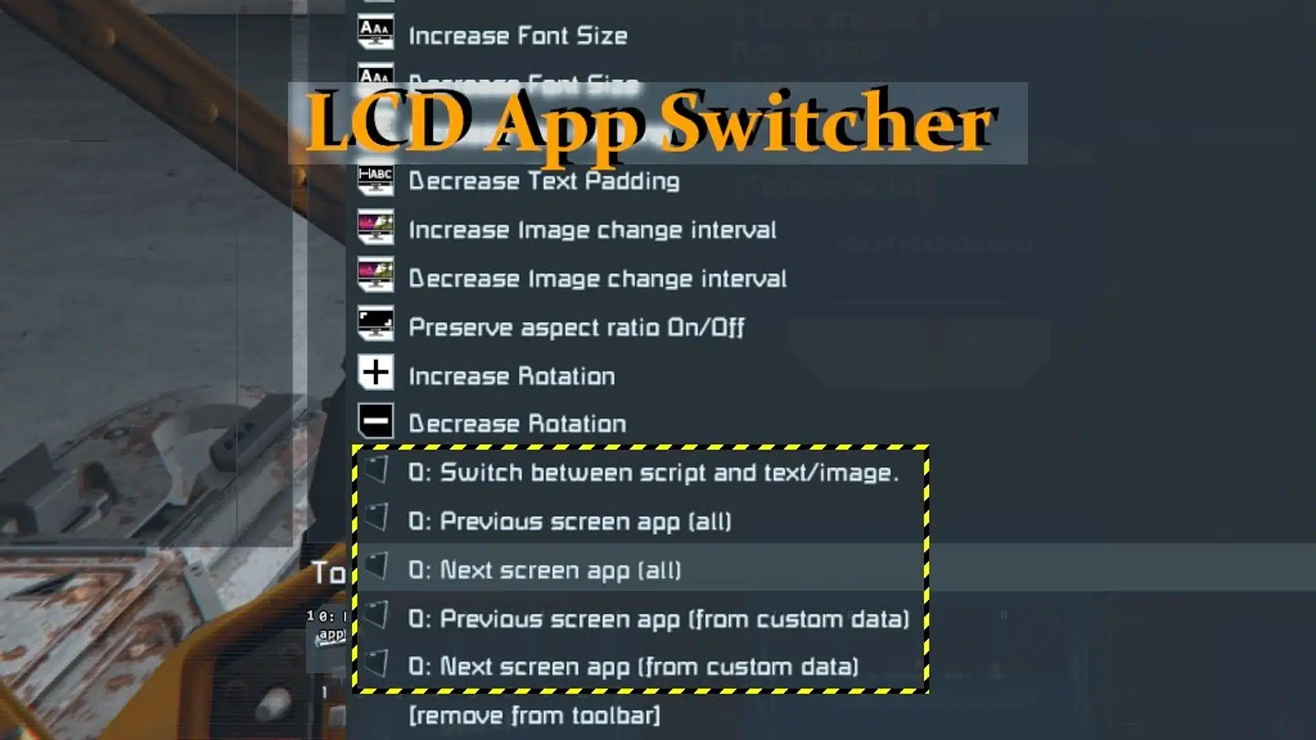 LCD App Selector by KiminazeThe LCD Screen App Selector allows changing the currently displayed app on any LCD via the “run” function of the programmable block. |