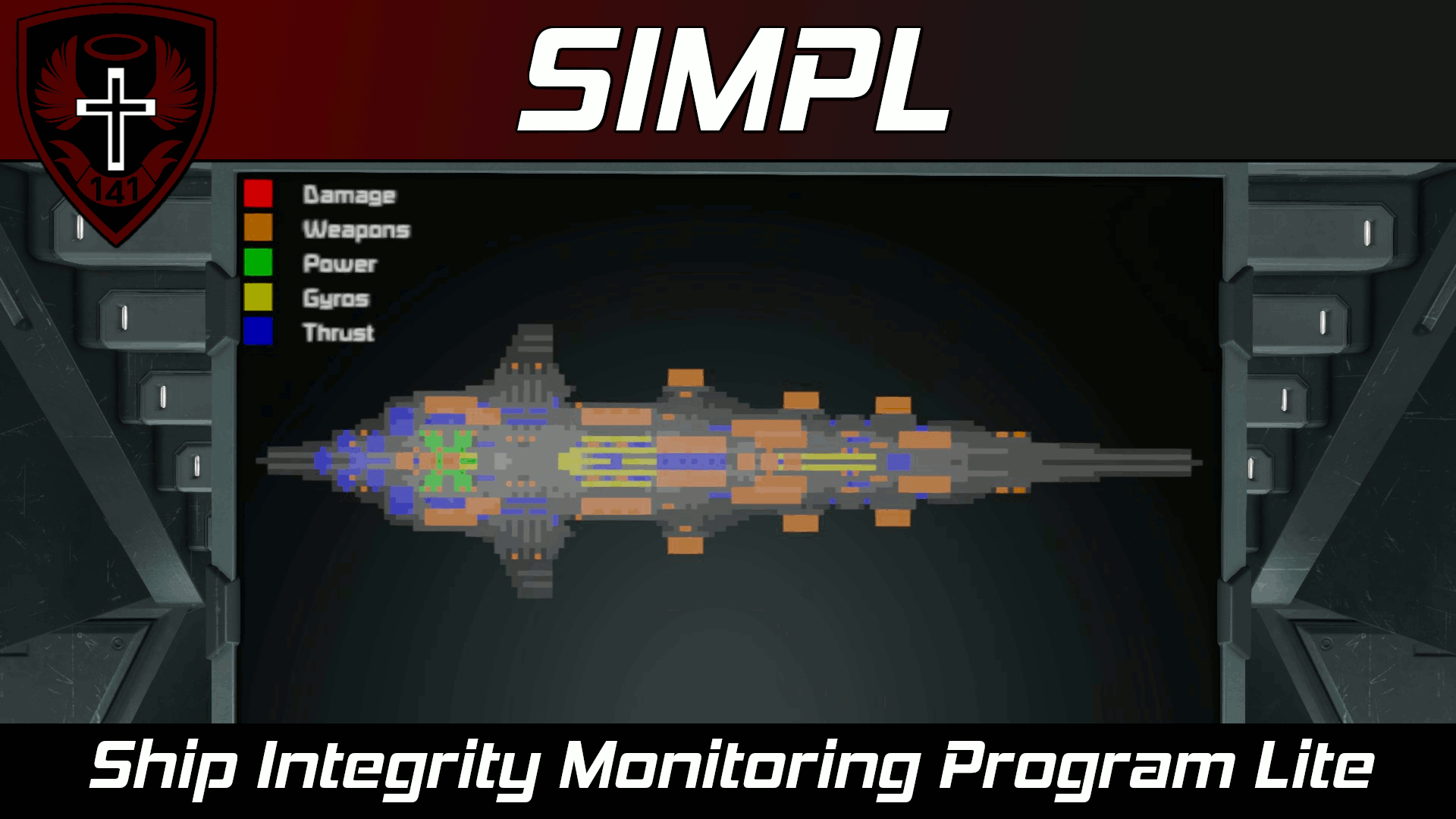SIMPL | Ship Integrity Monitoring Program LiteThis script draws a sprite-based 2D cross-section of your ship and will display destroyed blocks and highlight important ship systems. This script is designed to be as lightweight as possible (hence the name) while still retaining a decent amount of utility. Larger ships will take longer to scan than smaller ships because the script is designed to only go through a few blocks per run to keep the performance impact low. |