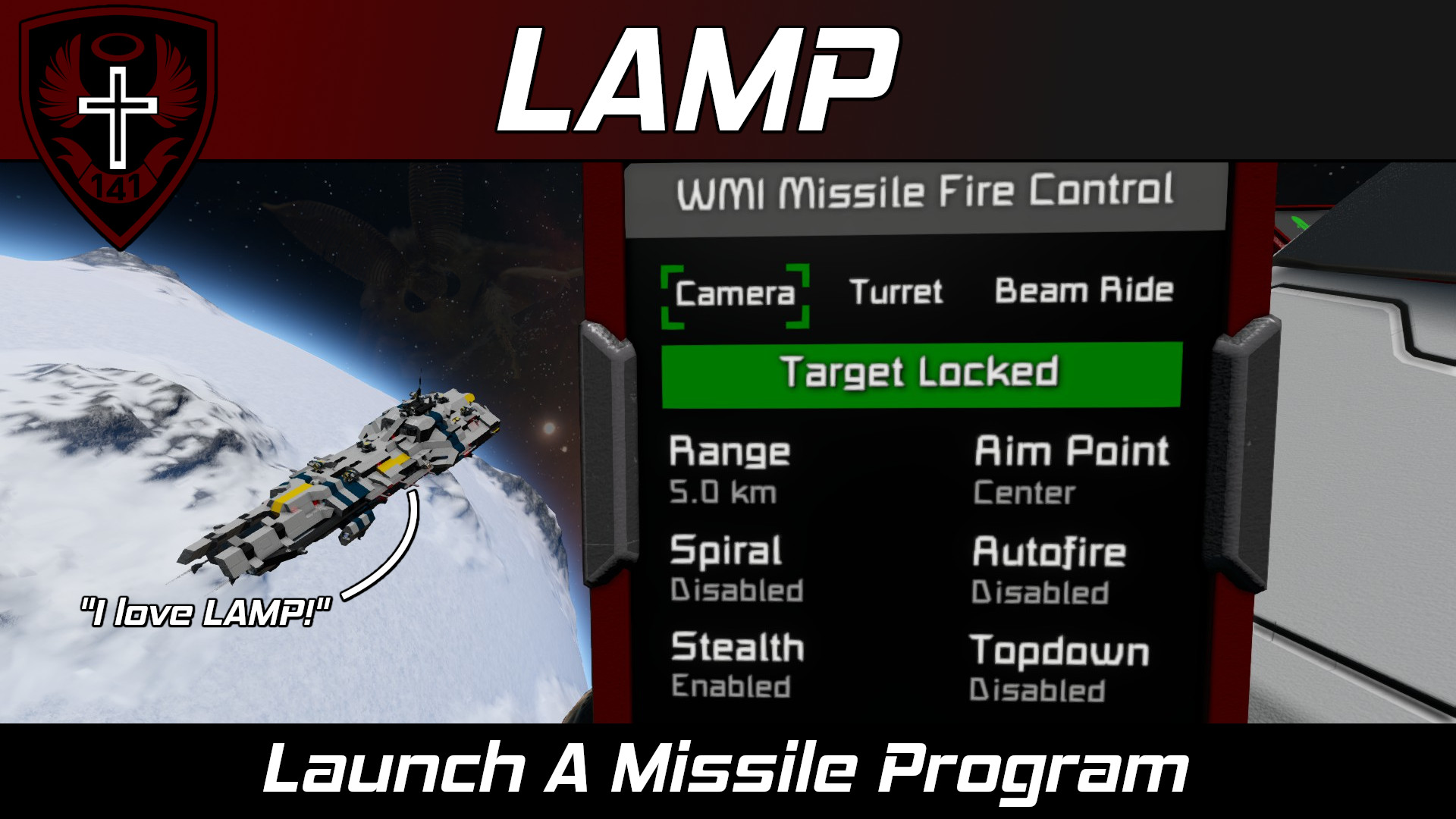 LAMP | Launch A Missile Program (for WHAM)LAMP is a fire control program for my homing missile script, WHAM. It allows you to fire guided Player Made Weapons (PMWs) at targets. You may be asking: “Why is it called LAMP?”. Well much like a lamp, this script illuminates a target for its missiles! (*Groan*) |